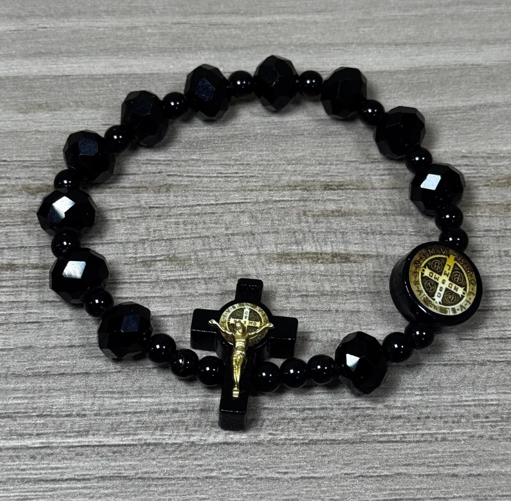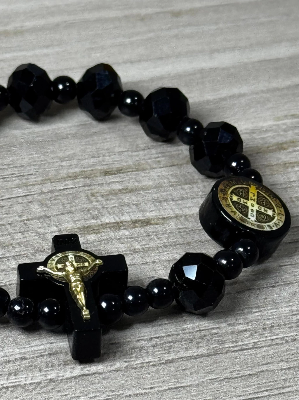 Com design marcante e ao mesmo tempo discreto, esta pulseira São Bento em cristal preto com detalhes dourados foi pensada para quem deseja unir elegância e vida de fé no dia a dia.