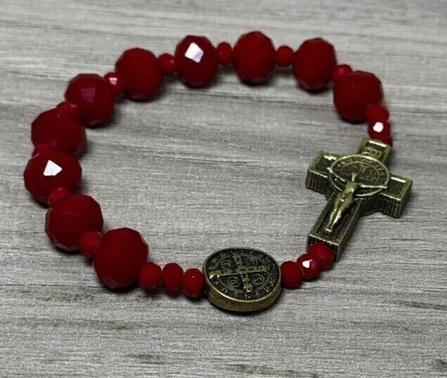 Esta pulseira São Bento em cristal vermelho facetado é um convite a viver a fé com coragem e profundidade.